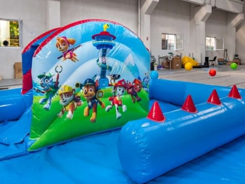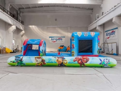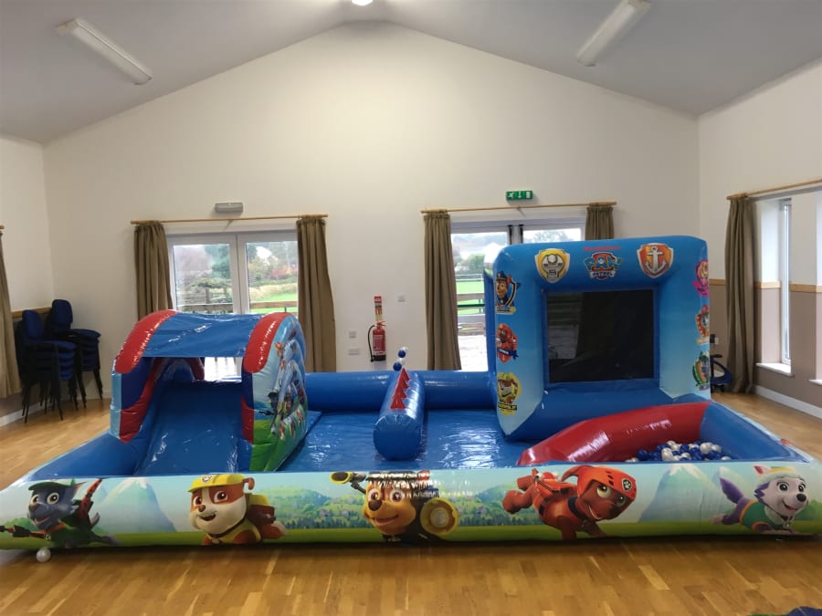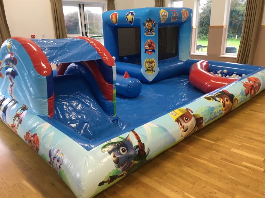 Our Licensed Nickelodeon Paw Patrol play zone is a lot more than just soft play this is a bouncer, a slide, and a ball pool. This unit can be used inside only. There is lot of fun to be had for the little ones and its all built in to this one unit. It features. A built in toddlers bouncy castle with netted sides for safety and easy viewing. A separate slide and the well loved magic air jugglers. A ball pool with 500(approx) balls is located on the front corner.