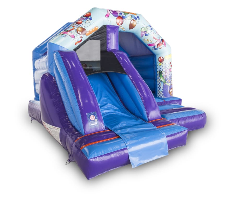 Our fantastic Party bouncy castle with a front facing slide is great for a mid size venues. It has party themed digital artwork.